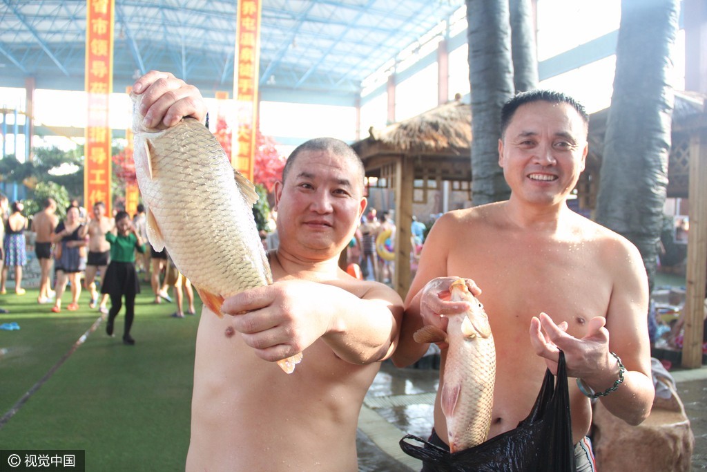 随着主持人一声令下,徒手趣味抓鱼大赛开始了,游客们纷纷涌入池内,开始尽情地抓鱼。